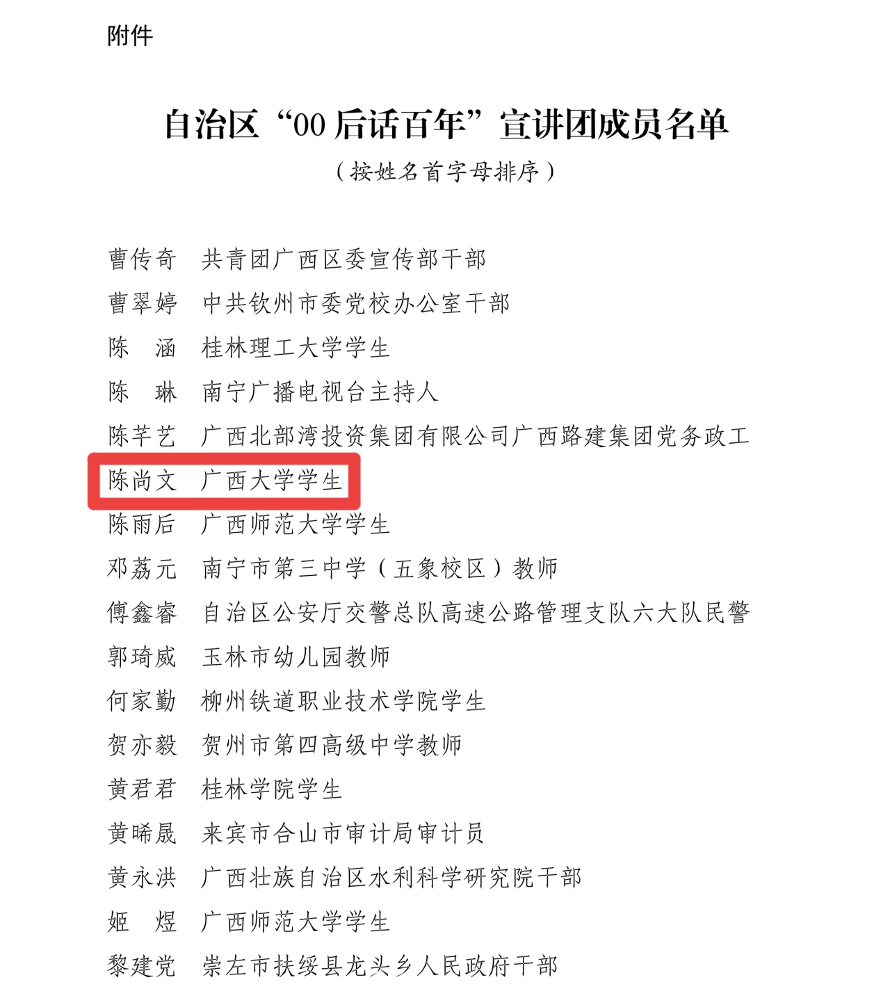 近日,自治区党委宣传部、自治区党委讲师团公布了自治区“00后话百年”宣讲团成员名单,共50名优秀青年入选自治区“00后话百年”宣讲团。我院陈尚文同学入选自治区“00后话百年”宣讲团。