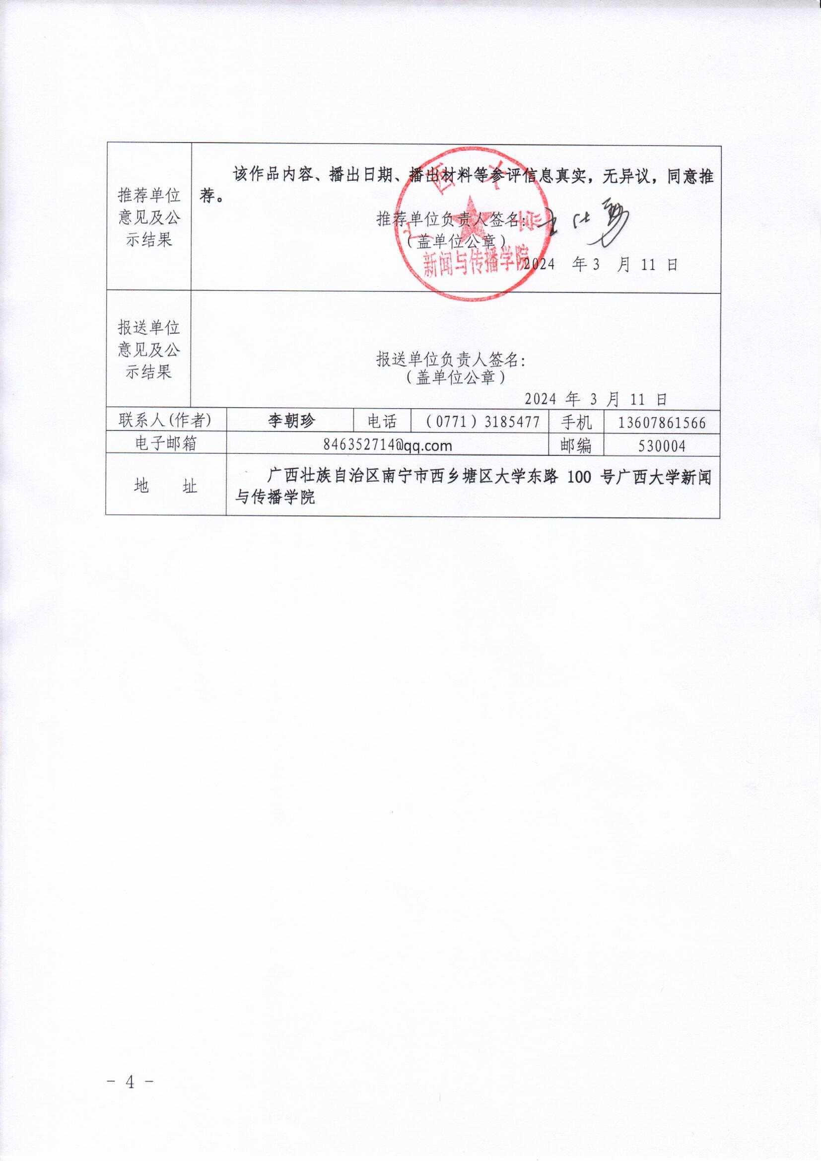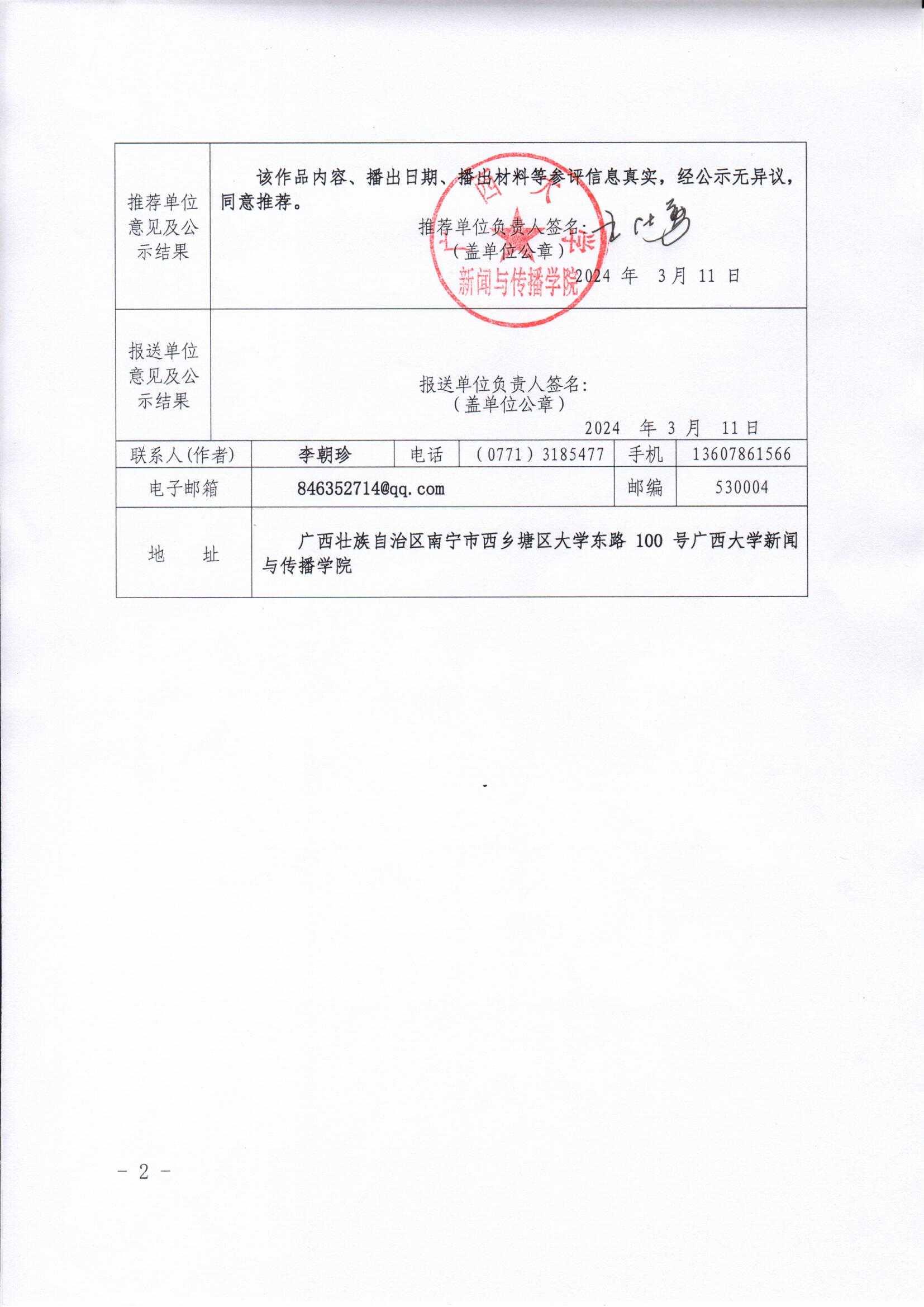 根据广西壮族自治区广播电视局、广西广电与网络视听协会发布的《关于2023年度广西广播电视和网络视听优秀作品推选报送工作的通知》(桂广发[2024]11号),现将我院参与报送的3份作品予以公示(作品内容详见附件)。公示时间:2024年3月11日至2024年3月15日。