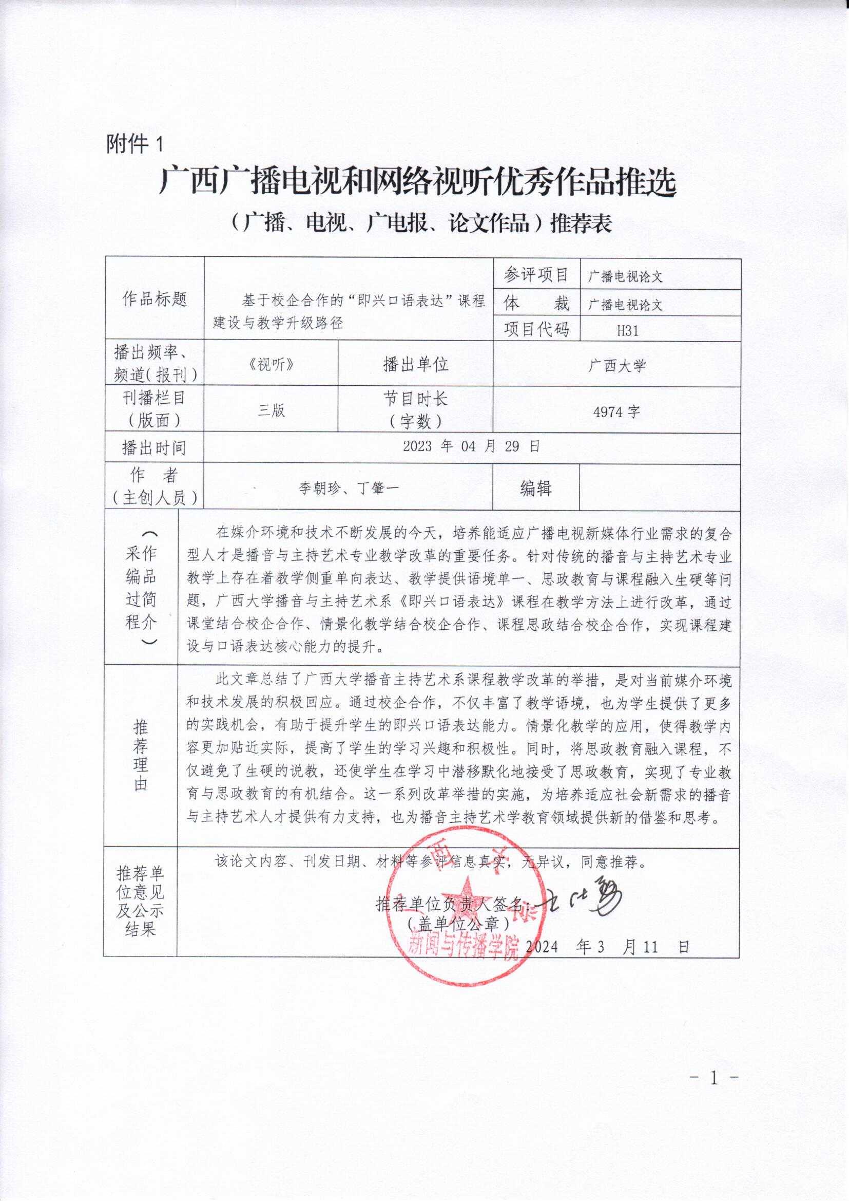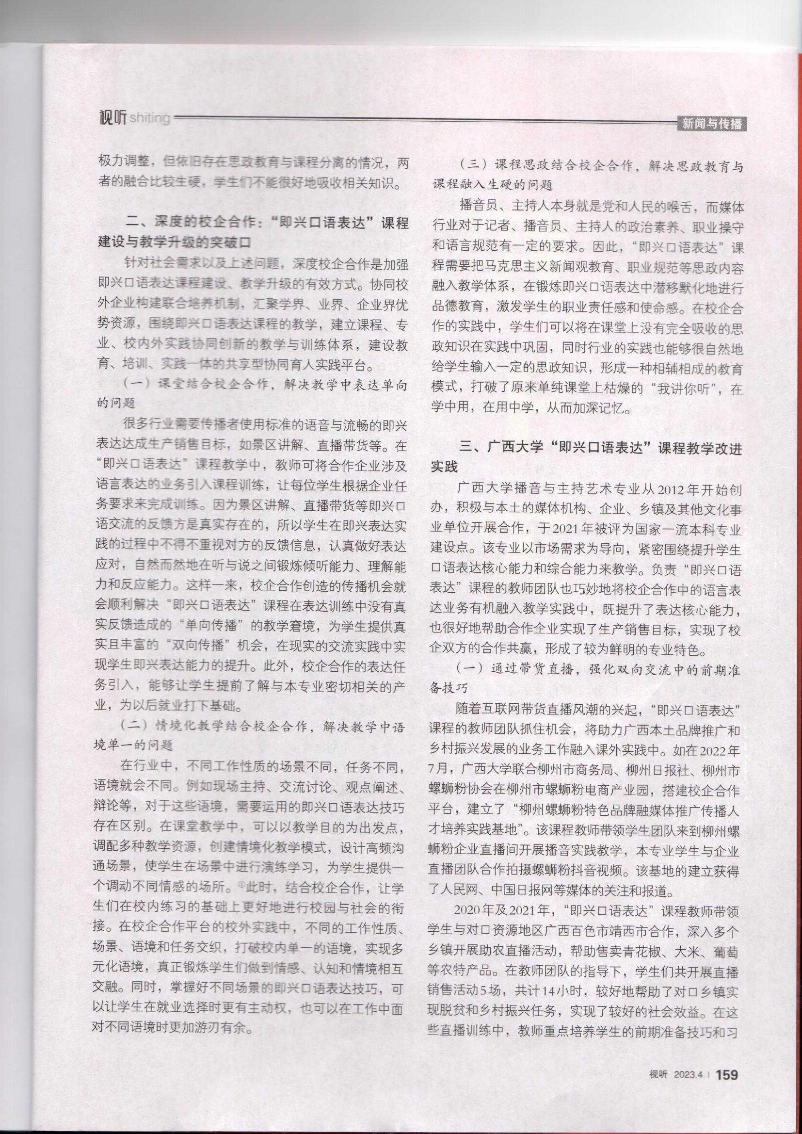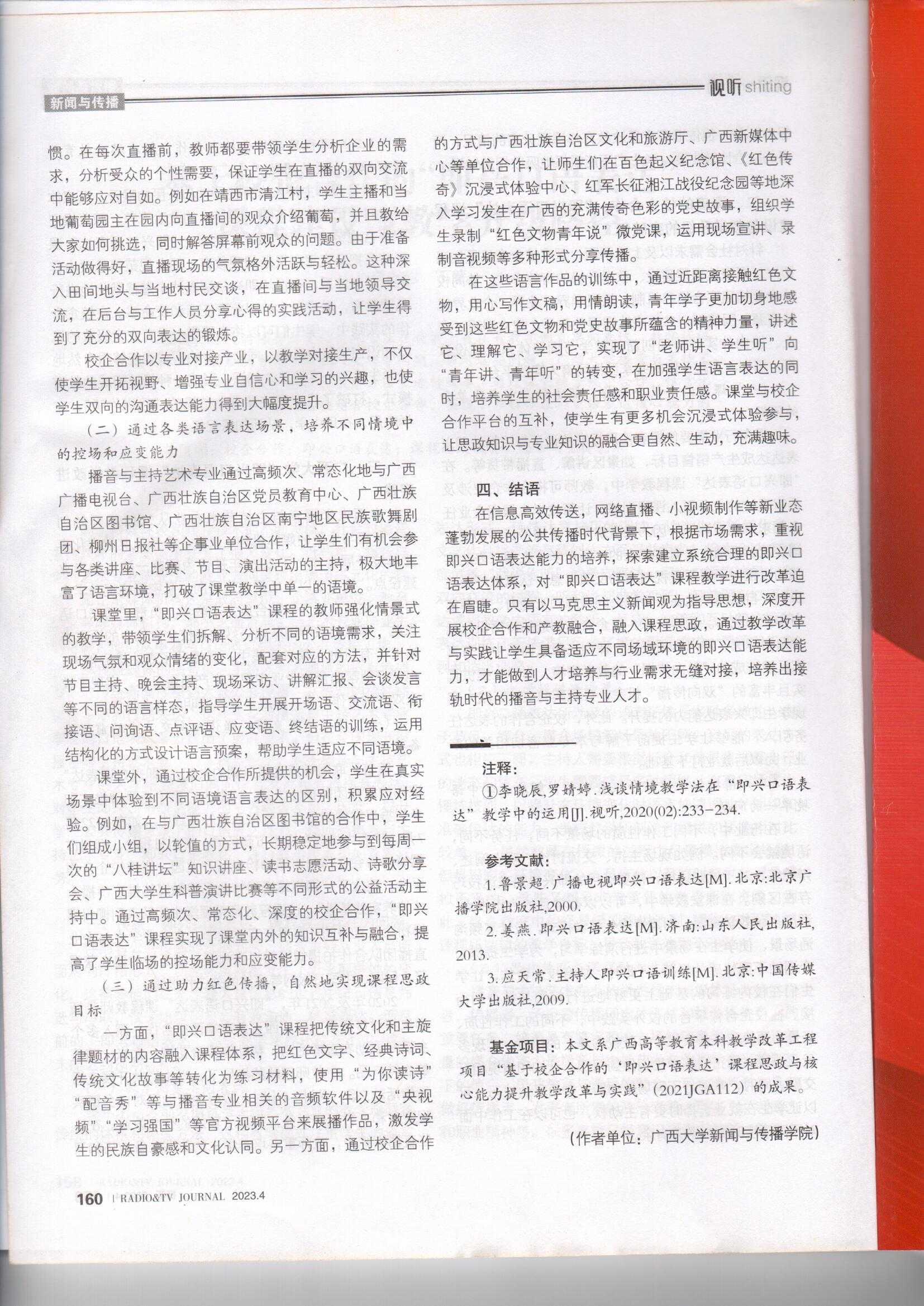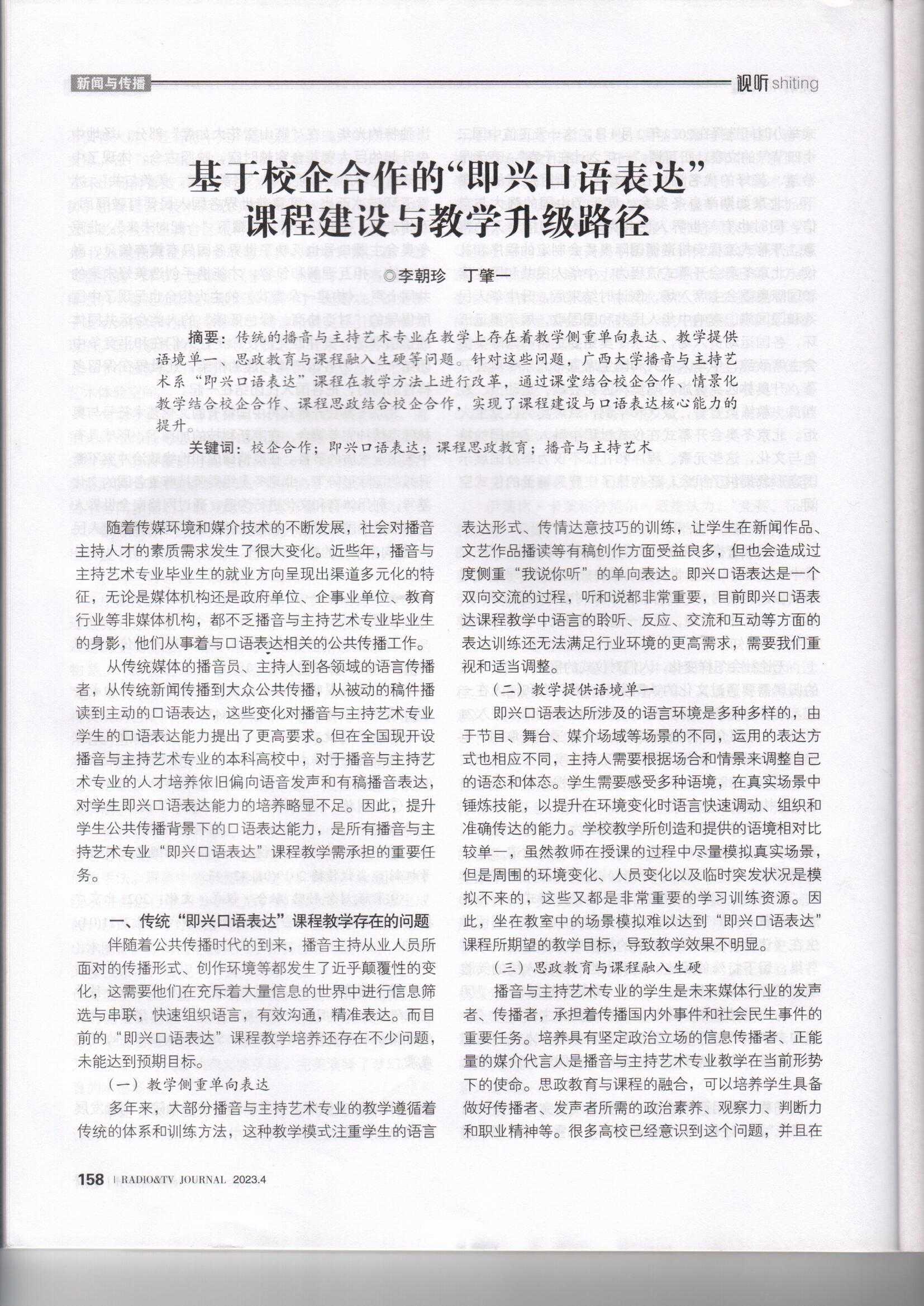广西广播电视和网络视听优秀作品推选论文作品推荐表:论文-《基于校企合作的“即兴口语表达”课程建设与教学升级路径》