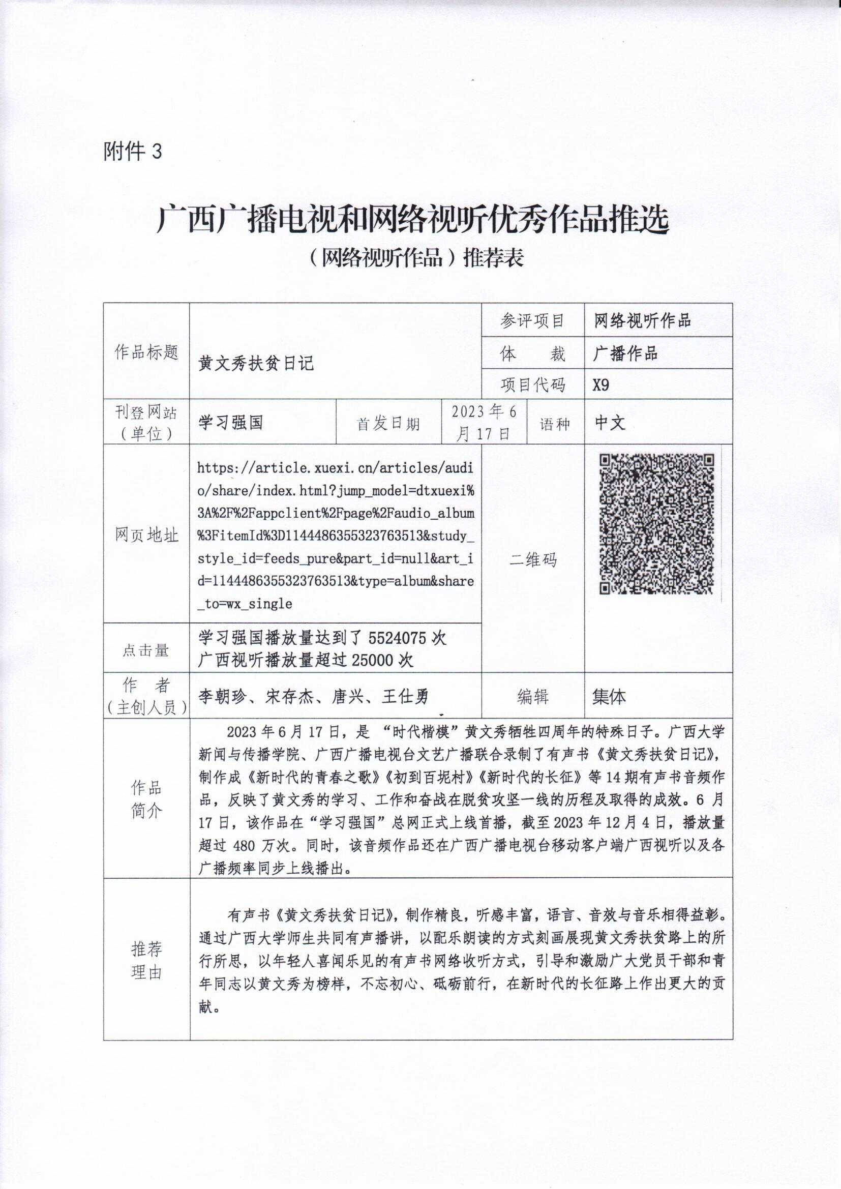 广西广播电视和网络视听优秀作品推选网络视听作品推荐表:网络视听作品-《黄文秀扶贫日记》