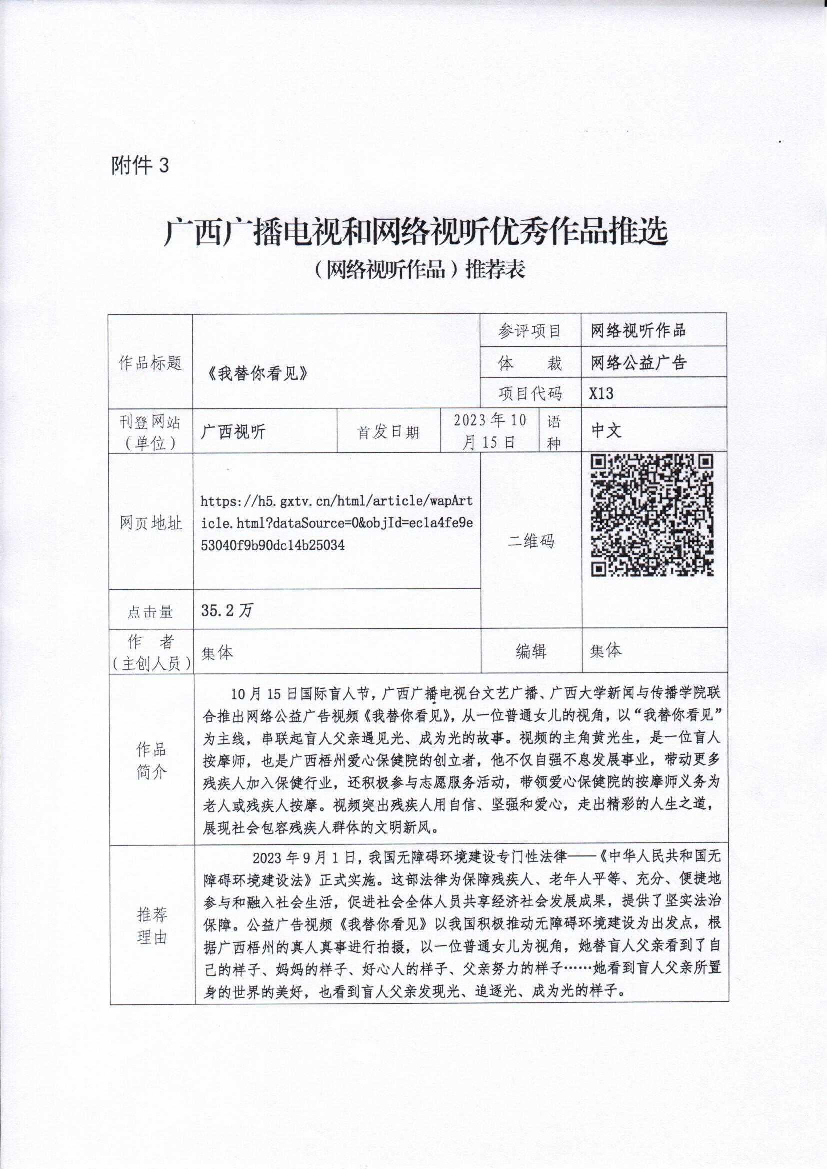 广西广播电视和网络视听优秀作品推选网络视听作品推荐表:网络视听作品-《我替你看见》
