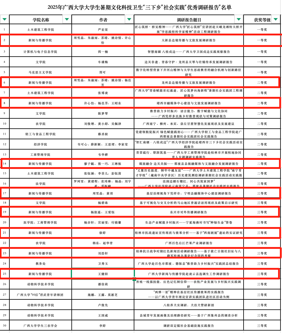 《大新县边境传播与文旅发展调研报告》获评“优秀调研报告”一等奖、《龙州县边境传播与文旅发展调研报告》《靖西市融媒体中心建设与文旅发展调研报告》《媒旅融合 边关共振一一那坡县县级融媒体与文旅融合发展调研报告》获评“优秀调研报告”二等奖、《基层治理视角下凭祥市、宁明县融媒体中心建设调研报告》《东兴市对外传播调研报告》《桂林抗日战争时期红色新闻活动调研报告--基于救亡日报社旧址与八路军桂林办事处纪念馆的考察》《桂林抗日战争时期红色新闻活动调研报告--基于救亡日报社旧址与八路军桂林办事处纪念馆的考察》《beats365亚洲版新闻与传播学院赴凌云县选调生工作调研报告》获评“优秀调研报告”三等奖,获评数量和占比均为全校第一。