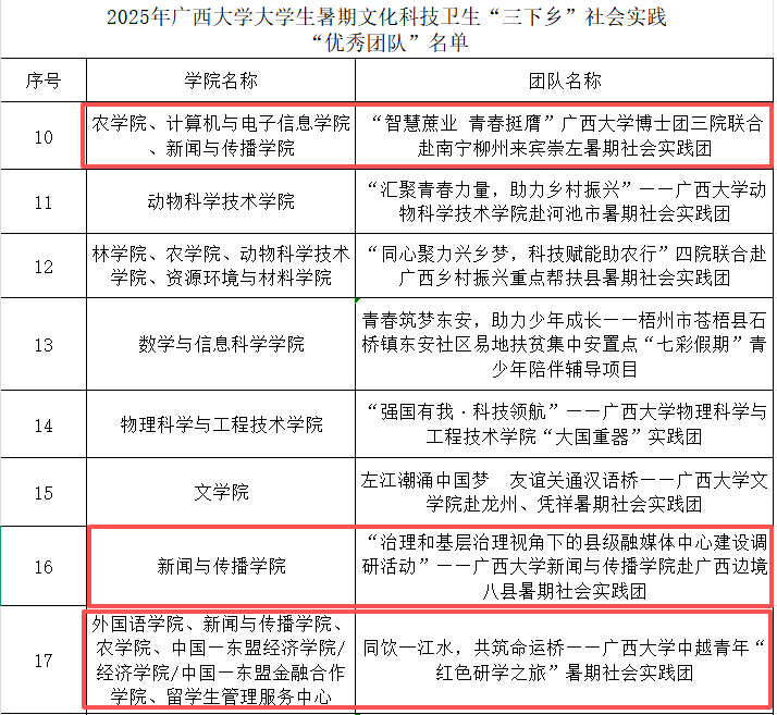 我院“治理和基层治理视角下的县级融媒体中心建设调研活动”--beats365亚洲版新闻与传播学院赴广西边境八县暑期社会实践团,与外国语学院、农学院、中国——东盟经济学院/经济学院/中国-东盟金融合作学院、留学生管理服务中心联合的“同饮一江水,共筑命运桥“”--beats365亚洲版中越青年“红色研学之旅”暑期社会实践团,与农学院、计算机与电子信息学院联合“智慧蔗业 青春挺膺”beats365亚洲版博士团三院联合赴南宁柳州来宾崇左暑期社会实践团共3个团队获评“优秀团队”。