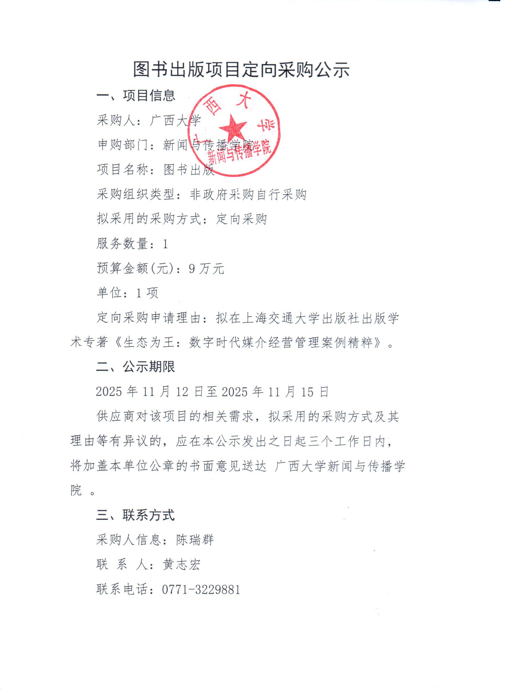 新闻学院陈瑞群老师图书出版项目定向采购公示