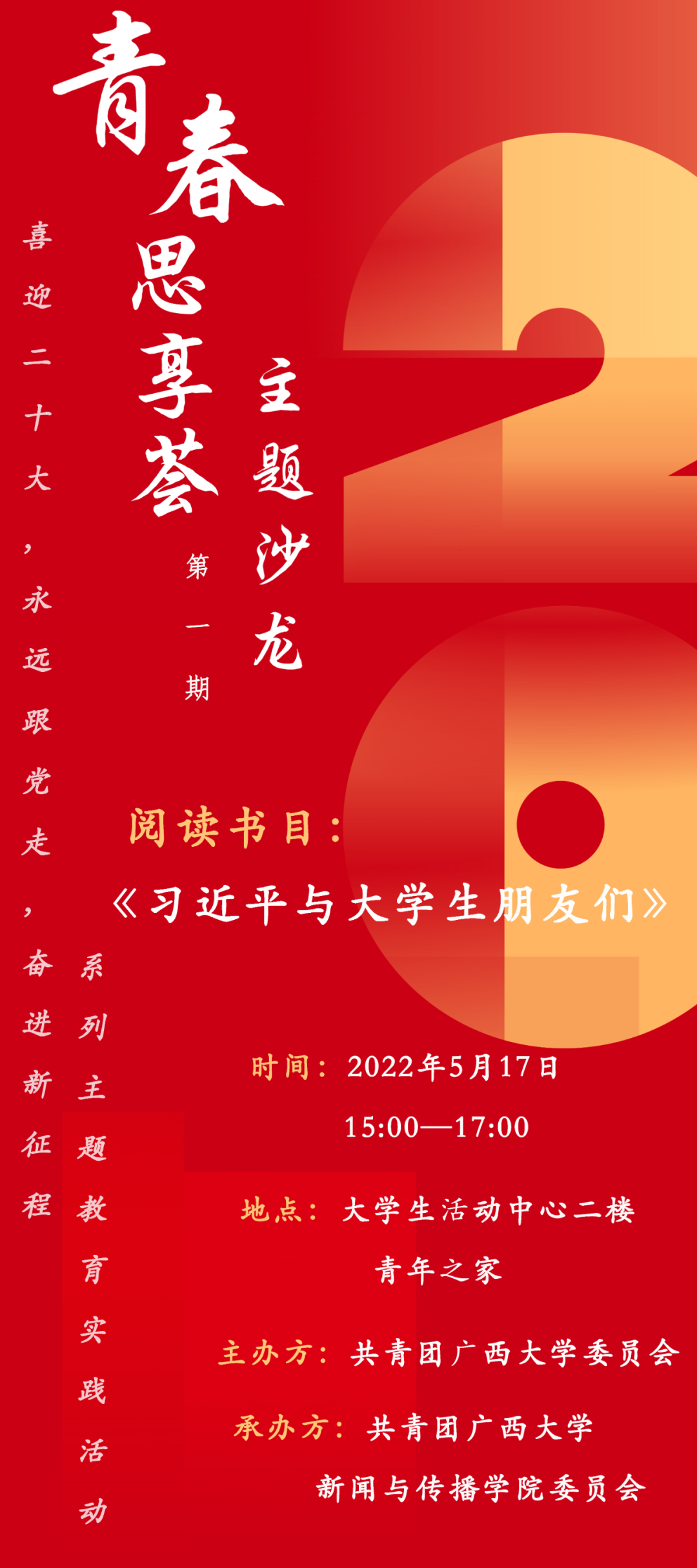 今年我们党将召开第二十次全国代表大会,这是包括广大青少年在内的全党全国各族人民政治生活中的一件大事,为加强团员青年的思想政治教育,搭建团员青年思想交流、学习分享的平台,团结引领广大团员青年坚定跟党走、建功新时代,以昂扬姿态迎接党的二十大胜利召开,共青团beats365亚洲版委员会决定举办beats365亚洲版“青春思享荟”系列主题沙龙。通过研读分享《习近平与大学生朋友们》等经典书籍,引导团员青年增进理解“两个确立”的决定性意义, 增进对习近平总书记和党中央的情感认同和行动追随,引领团员青年昂扬奋斗激情。