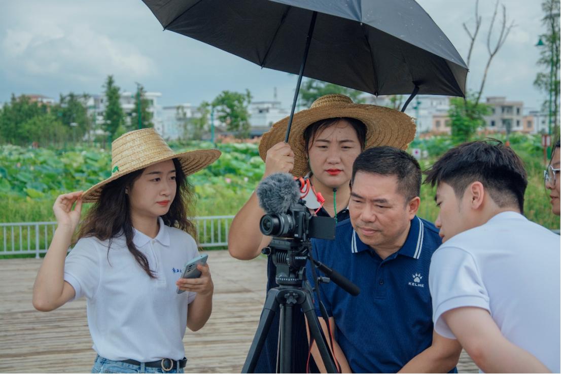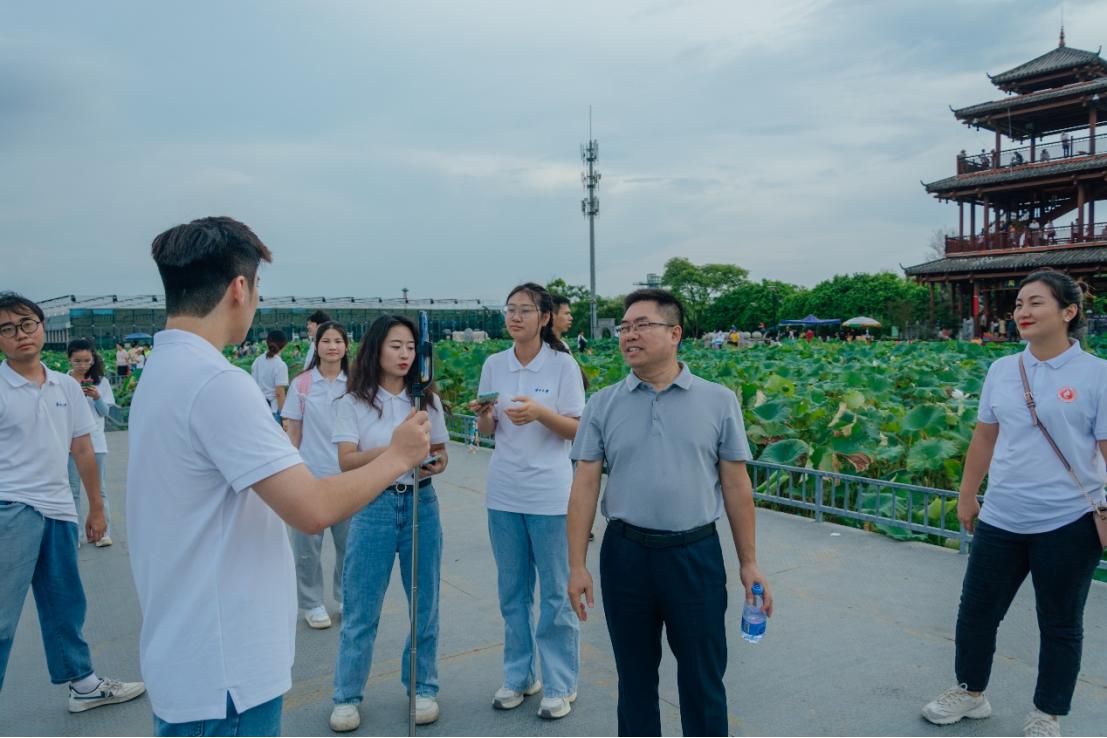 7月31日清晨,银健书记、刘梦娟老师指导实践团队进行“求真传美”文旅宣传视频拍摄。实践团队先后前往荷韵廊、听雨亭、醉莲阁、莲心岛、濯心台等地点,用新闻学子的声音和画面,展现独特的覃塘之美。银书记表示:“大家在学校进行了专业知识的学习,需要积极投身实践,在实践中检验自身。