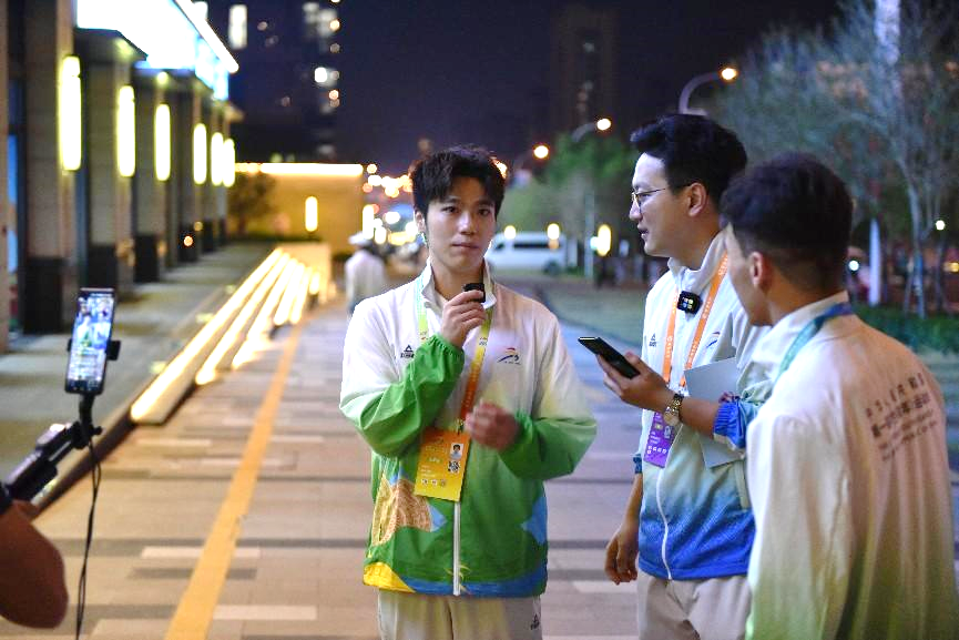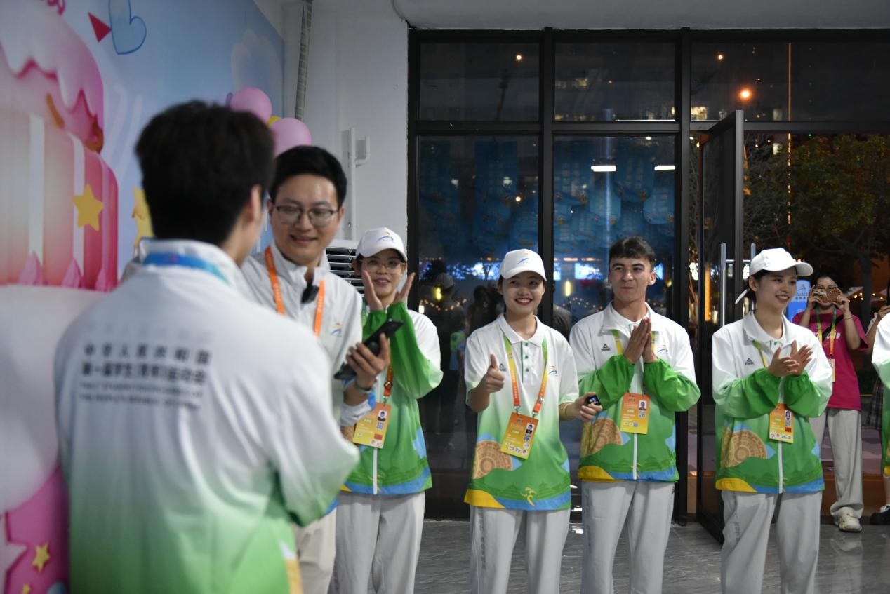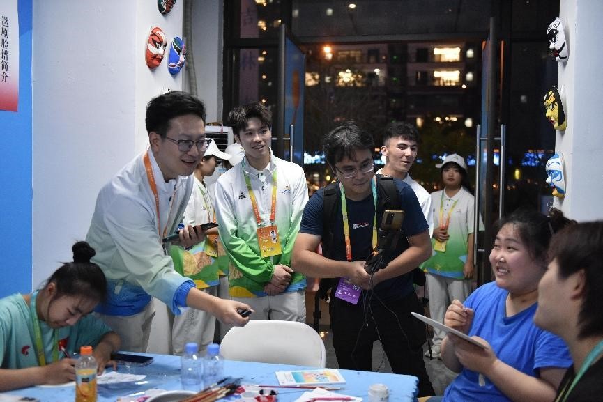 探访队首先来到文化与娱乐区域,其间设有若干个小房间,每个小房间都设有广西民族文化项目或娱乐项目,包括剪纸、脸谱、棋类游戏、投壶等项目。在剪纸小房间中,工作人员为大家介绍了剪纸艺术。在娱乐小房间中,唐子涵和阿西木江与运动员们进行了有趣的交流。为了活跃现场气氛,唐子涵为大家演唱了一首歌,歌声刚落周围就响起大片掌声。运动员们和志愿者们在这里相互交流、放松娱乐,房间里时不时传出开心的笑声。唐子涵介绍道,此区域的文化与娱乐小房间设置得很用心,运动员可以在紧张的比赛空隙来到这里放松心情,以更好的状态迎接下一场比赛。