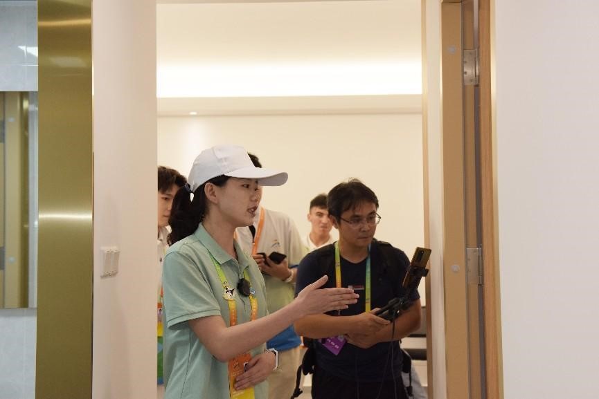 (南宁市执委会青运村工作人员马月月为大家介绍运动员公寓)