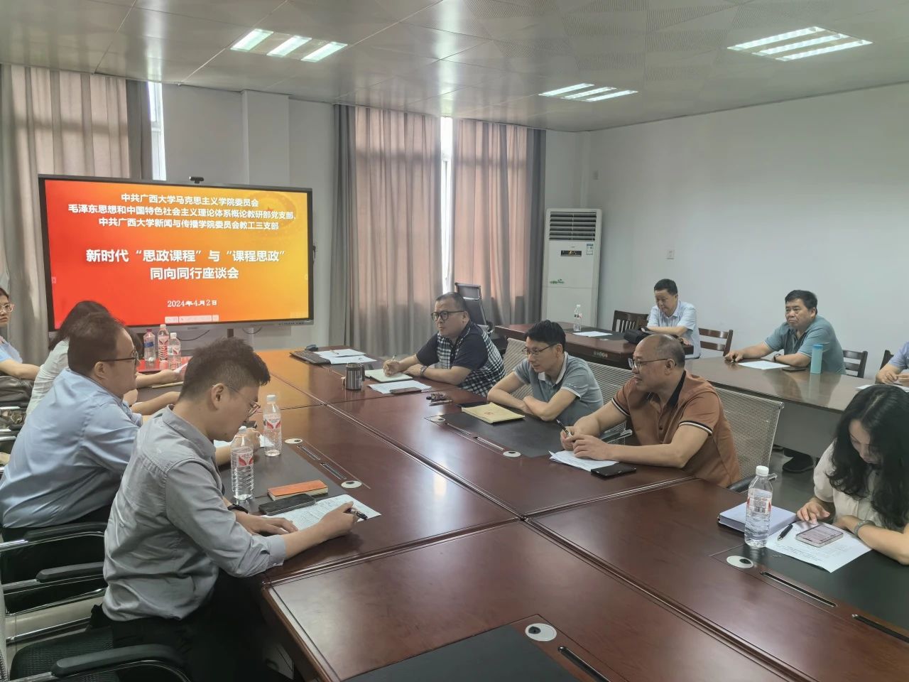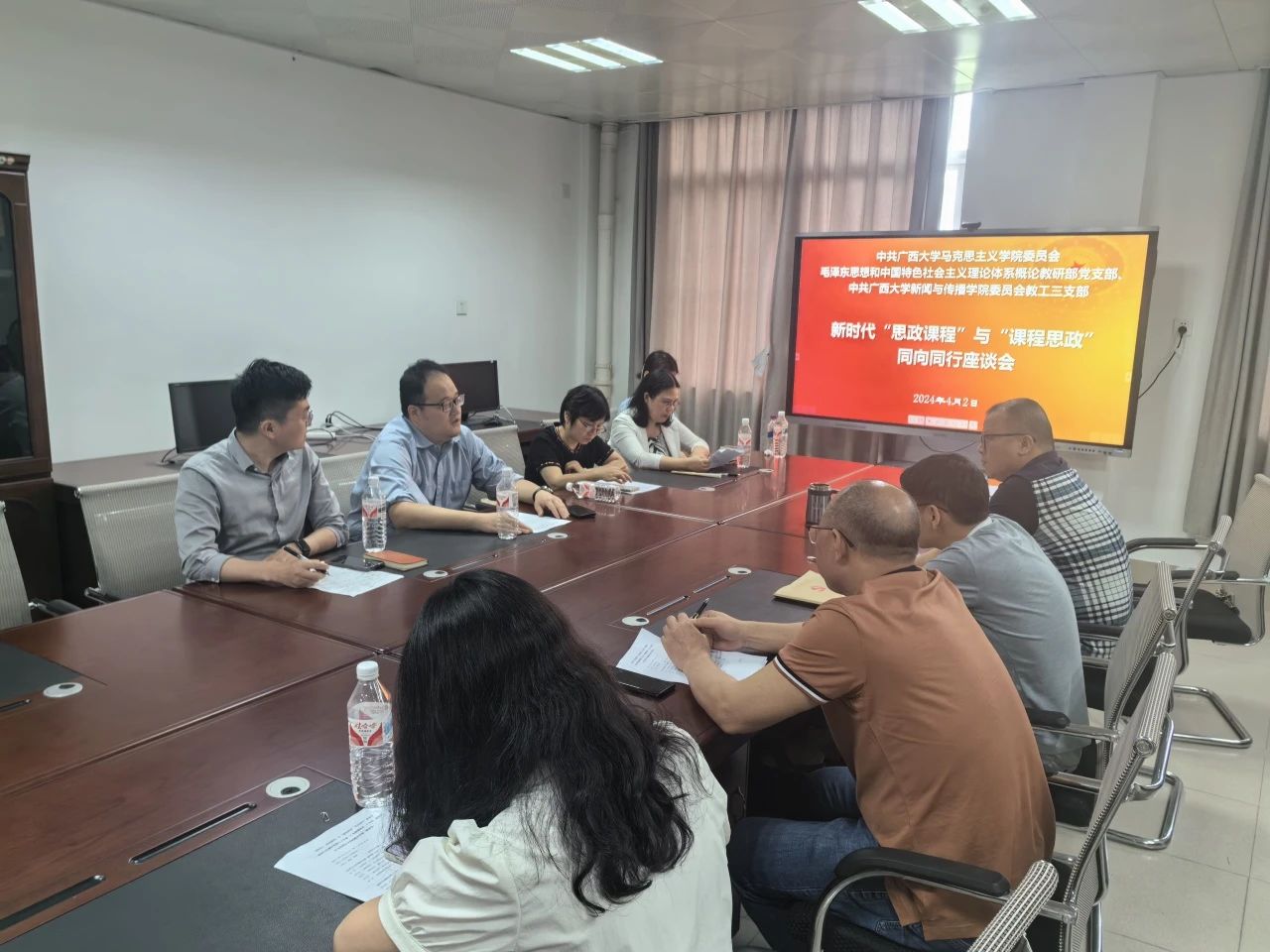 为加强学院间的教师沟通交流,共同提升课程思政教学科研水平 ,4月2日下午新闻与传播学院教工三支部与马克思主义学院概论支部在马克思主义学院501会议室内联合召开了一次课程思政座谈会。座谈会围绕“新时代‘思政课程’与‘课程思政’同向同行”主题,展开了深入的探讨与交流。会议探索了如何更好地将思政教育融入各专业课程中,推动大学生全面发展。会议由两个支部的书记杨勇同志和薛强同志主持。