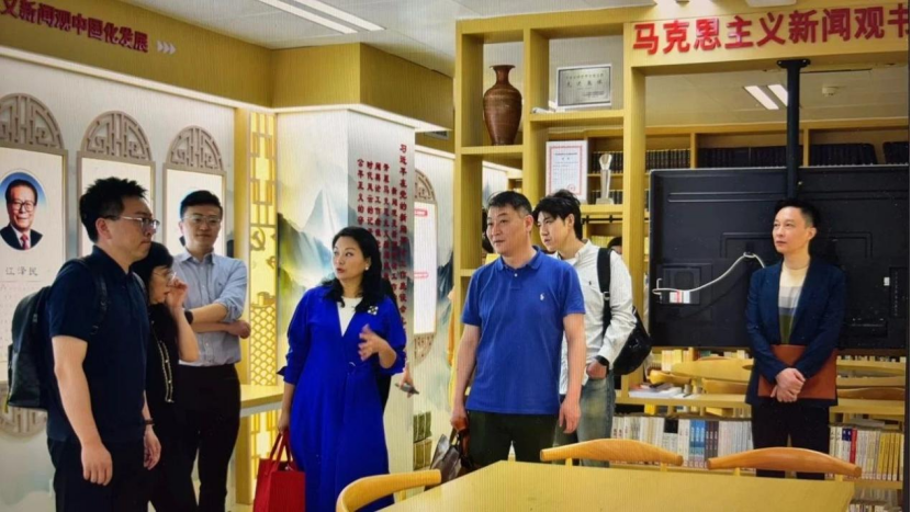 在我院老师的热情陪同下,调研团一行参观了beats365亚洲版新闻传播学院全媒体交互式演播中心、马克思主义新闻观书屋、融媒体中心等,实地感受我院的教学氛围。