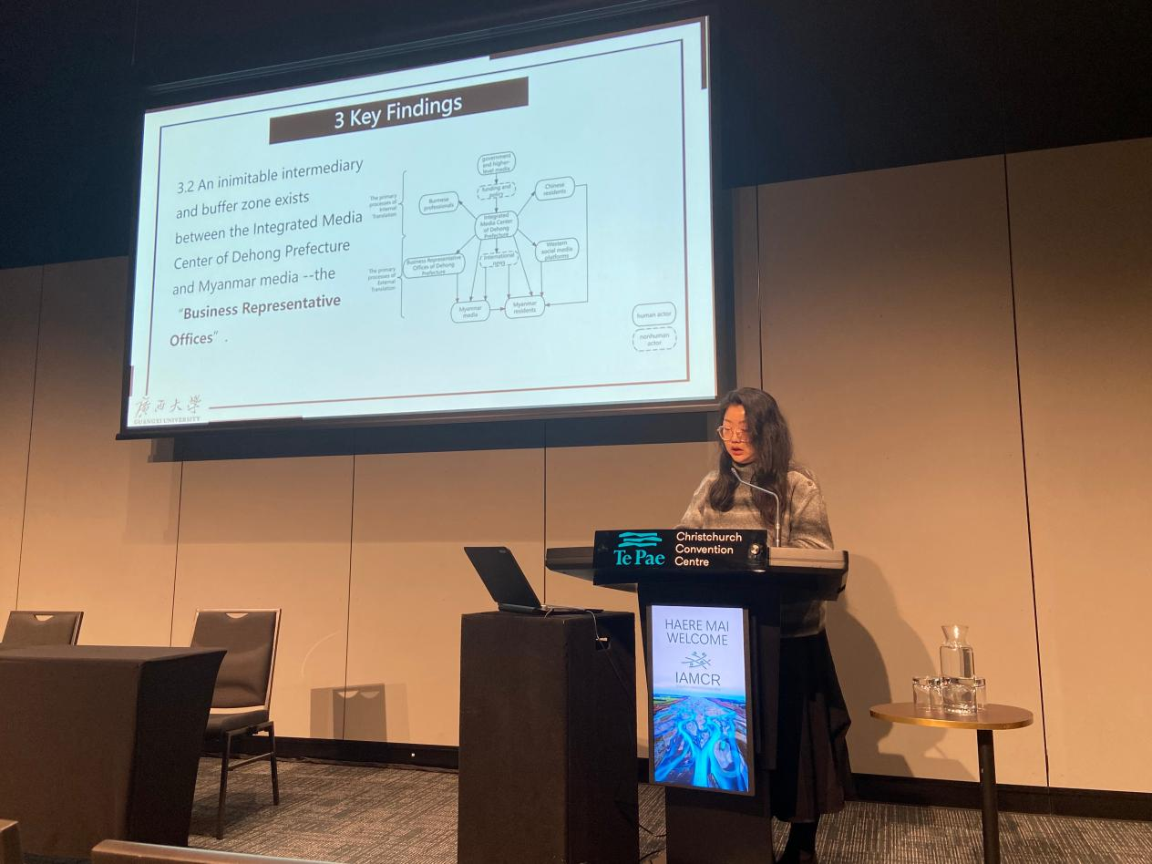 2024年7月3日,我院2022级硕士研究生涂文嫱在国际媒介与传播研究学会(IAMCR)年会上发表了题为《行动者网络理论视角下中国边境地方媒体对缅传播研究》的学术报告。