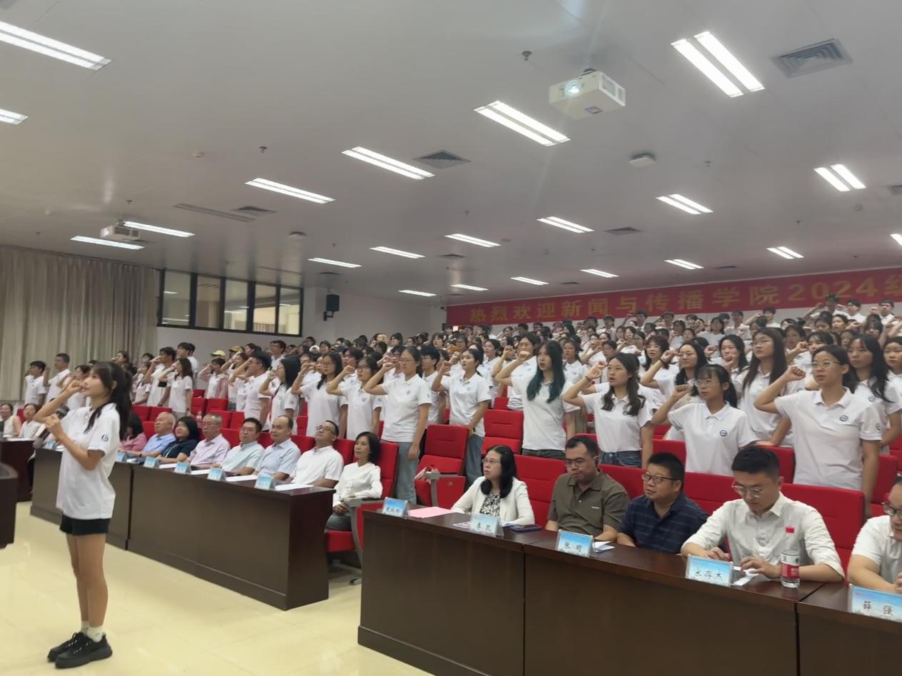最后,2024级新生集体宣誓,奏唱校歌。“铁肩担道义,妙手著文章”,慷慨激昂的誓词传递了新闻与传播学院新一代传媒人在日新月异的时代里不变的理想和信念。