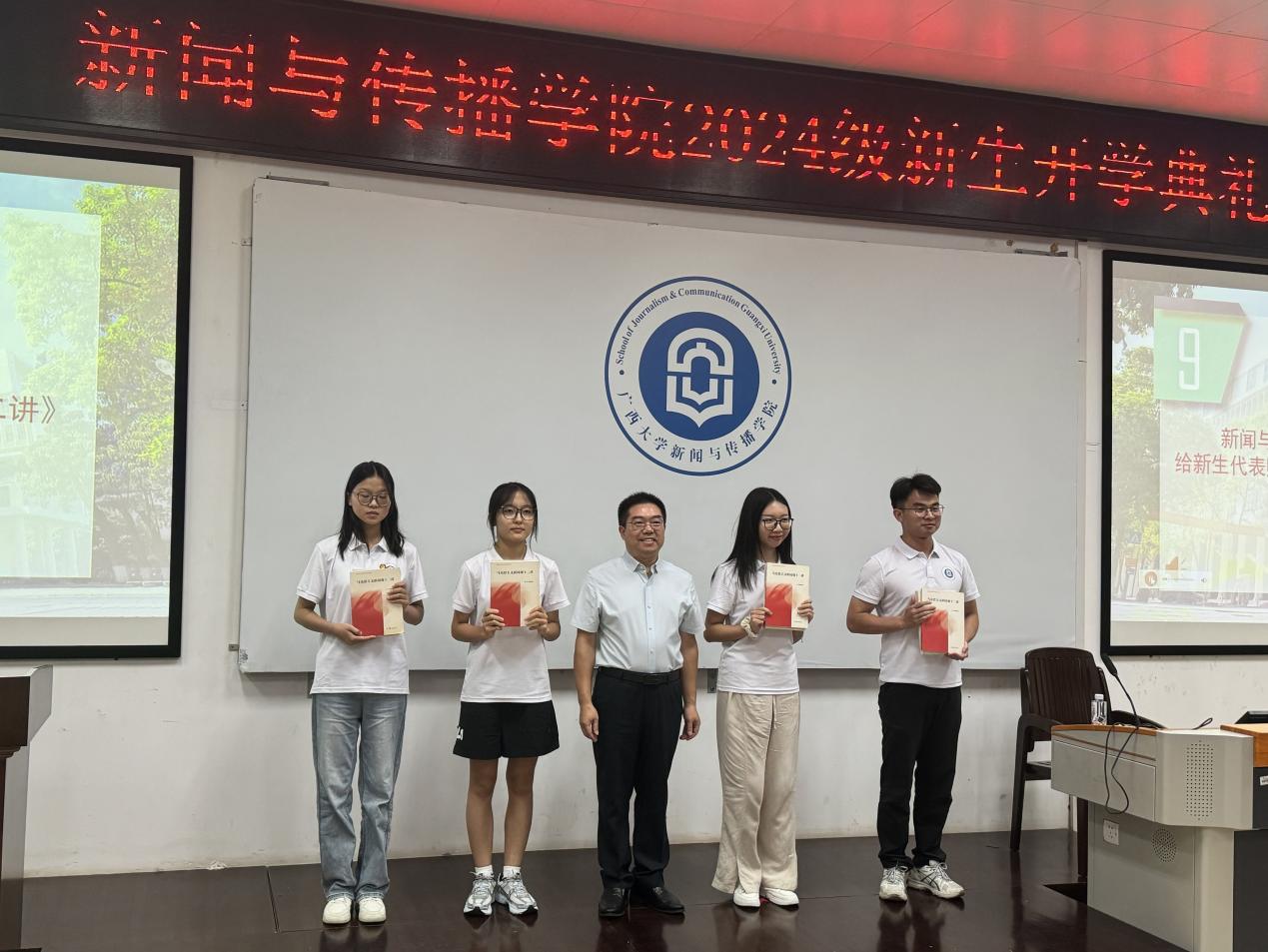 学院党委书记银健向新生代表赠送《马克思主义新闻观十二讲》,鼓励同学们学习传承马克思主义新闻观,将其作为治学的指引。