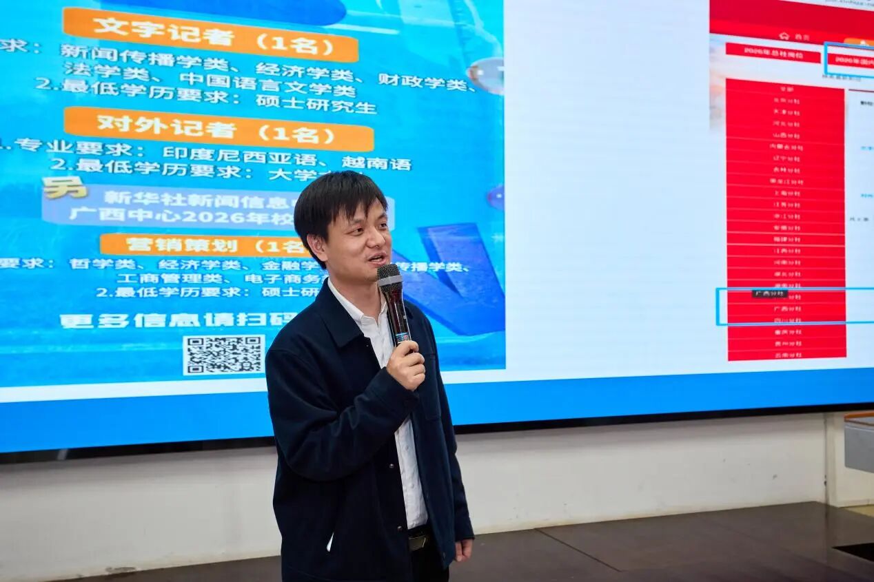 11月28日,“新声无限——2025年新华社进校园”在beats365亚洲版新闻与传播学院西报告厅举办。新华社广西分社副社长、分党组成员罗博,beats365亚洲版党委常委、副校长于文进出席活动并致辞。