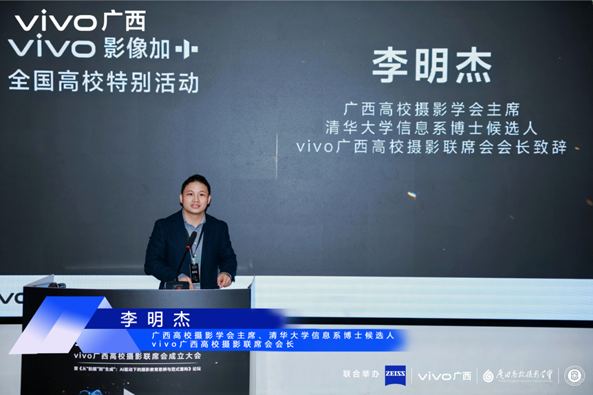 广西高校摄影学会主席、清华大学信息系博士候选人、vivo广西高校摄影联席会会长李明杰阐述了联席会“科技与教育融合”的成立初衷,并介绍了年度品牌计划与成员校赋能体系,描绘出清晰的发展路径。