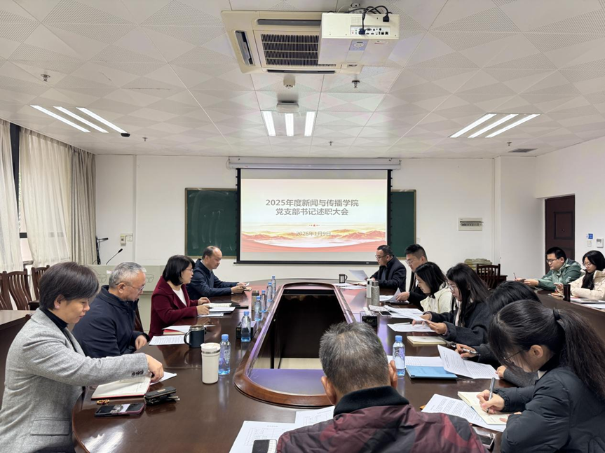 会上,教工第一党支部、教工第二党支部、教工第三党支部,以及学硕班党支部、专硕第一党支部、专硕第二党支部,新闻专业一班学生党支部、新闻专业二班学生党支部、广告专业学生党支部、播音与主持专业学生党支部等10位支部书记依次进行现场述职。大家重点围绕政治建设与思想建设、履行抓党建第一责任人职责、落实“五基三化”系列行动、发挥党支部和党员示范引领作用、推动党建与业务工作深度融合等五个方面,汇报了2025年度的履职情况及实际成效。各支部既总结了特色做法与阶段性成果,也实事求是剖析了当前存在的问题,并提出下一步党建与学科专业协同发展的改进思路和具体措施。