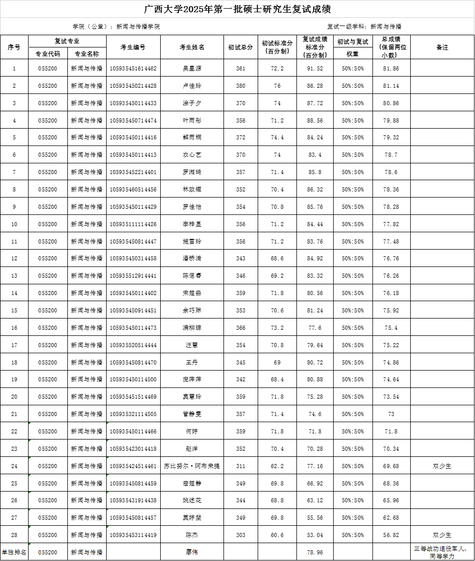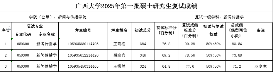 beats365亚洲版新闻与传播学院2025年新闻传播学、新闻与传播一志愿考生复试成绩如下,如有异议,请联系新闻与传播学院研究生办公室反映,联系电话:0771-3229833。
