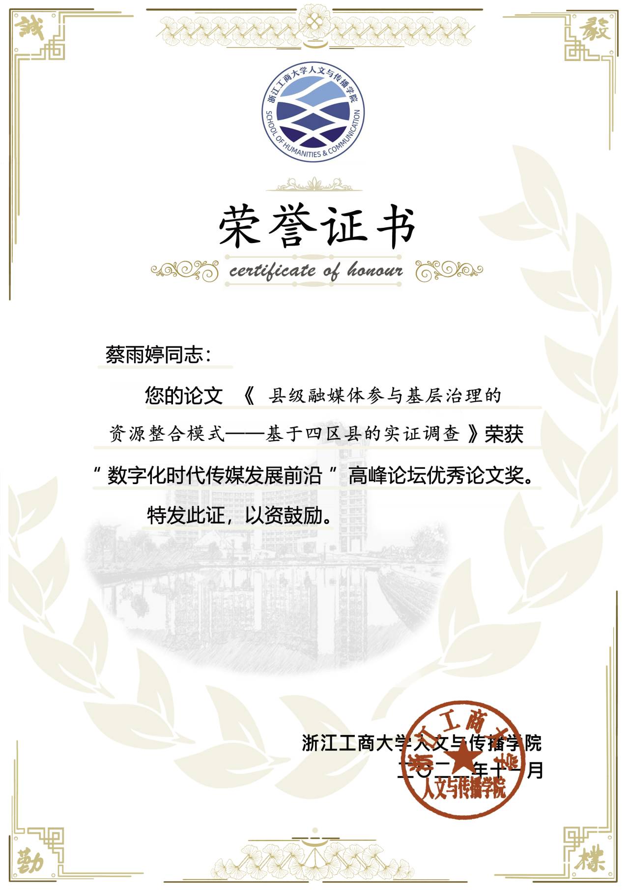 媒体是社会中的中介,起着连接和沟通不同群体的作用。作为社会中介的媒体如何整合多方资源?11月26日,我院蔡雨婷博士在浙江工商大学召开的“数字化时代传媒发展前沿”高峰论坛中,分享了研究论文《县级融媒体参与基层治理的资源整合模式——基于四区县的实证调查》,对上述问题进行了阐述。论文还荣获本次论坛优秀论文奖。