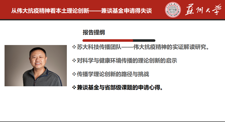 1月22日晚,苏州大学传媒学院教授、中国科技新闻学会副秘书长贾鹤鹏应邀为我院师生作了题为《从伟大抗疫精神看本土理论创新——兼谈基金申请得失》线上讲座。讲座由学院气候与健康传播研究中心主任吴海荣教授主持,王辉副院长以及近150名师生在线参与。