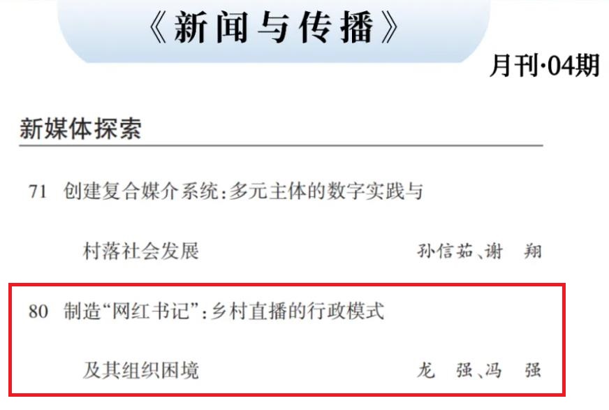 我院龙强博士发表在《新闻与写作》(CSSCI来源期刊)2025年第1期上的《制造“网红书记”:乡村直播的行政模式及其组织困境》一文,被人大复印报刊资料《新闻与传播》2025年第4期全文转载。