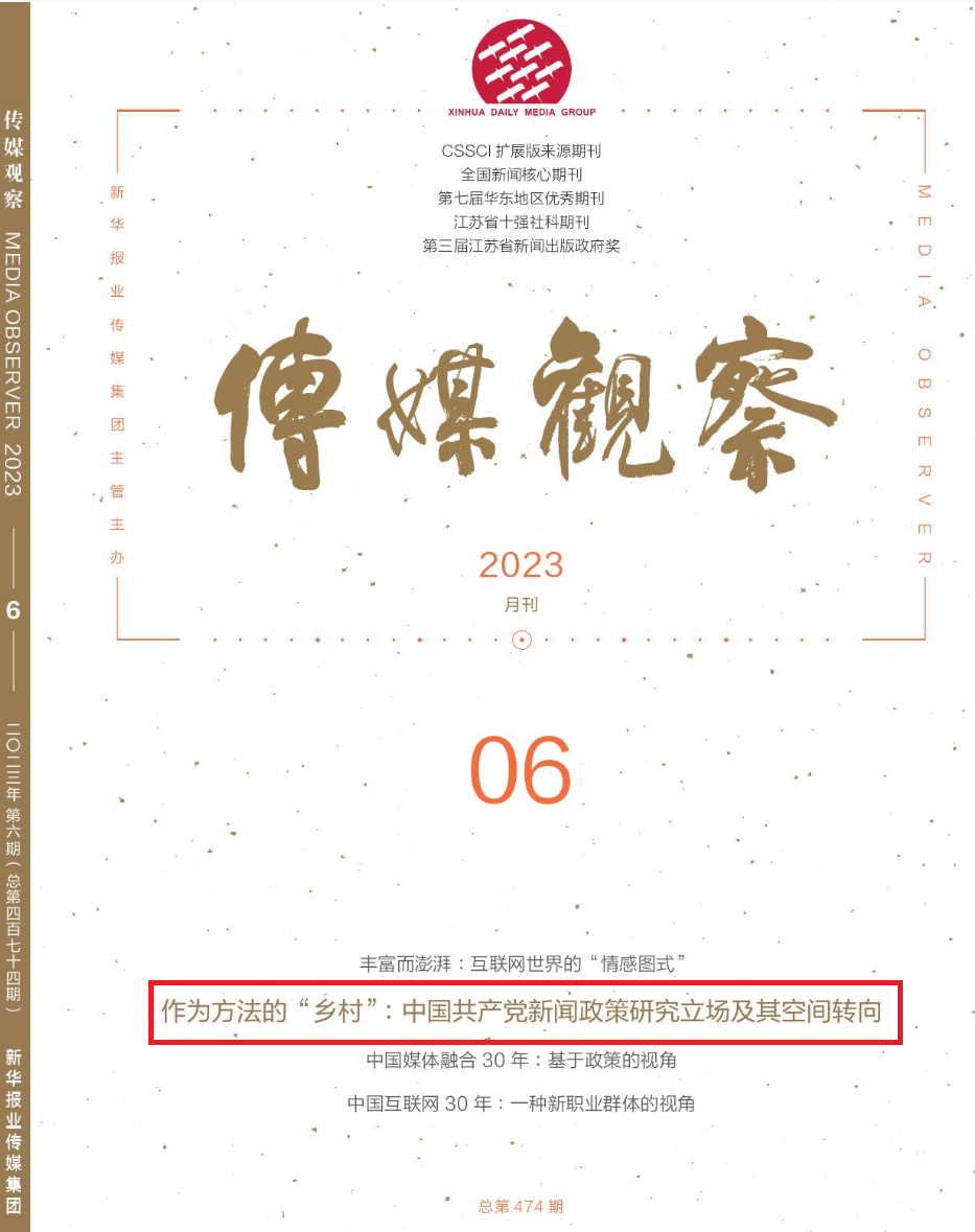 聚焦新闻政策空间转向和演进规律,王仕勇教授着力破解理论本土化与时代化的核心命题,将乡村引入新闻政策的研究视野。在《传媒观察》(CSSCI来源期刊)2024年第6期发表的《作为方法的“乡村”:中国共产党新闻政策研究立场及其空间转向》一文中,他从新闻政策制定的“地方性”因素考量出发,回顾改革开放以来“乡村”之于新闻传播的学术研究,提出以乡村为边界的“乡村新闻政策”,力图重新审视乡村新闻政策、乡村传播的重要地位。