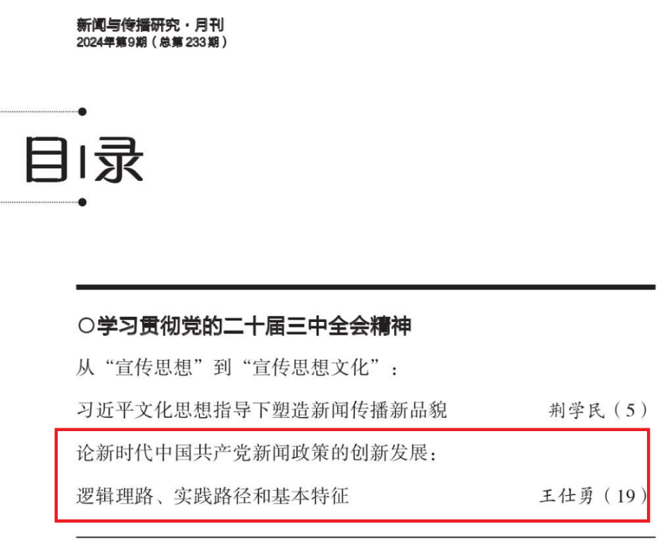 基于中国新的历史方位、社会主要矛盾变化和媒介环境变迁的视角,王仕勇教授在2024年第9期《新闻与传播研究》(CSSCI来源期刊,学科顶刊)发表的《论新时代中国共产党新闻政策的创新发展:逻辑理路、实践路径和基本特征》一文中指出,中国特色社会主义新时代是中国共产党新闻政策的创新发展期。这一时期新闻政策的调整和变化带有根本性、战略性、全局性意义,有强烈的时代意识和清晰的历史方位感。党和政府出台了促进报业转型的媒介融合政策,为广电发展提供新动能的智慧广电政策,基于高新技术的媒体融合期的互联网新闻政策。这些政策主要根据社会主要矛盾变化调整,要求新闻传媒为“攻坚期和深水区”改革提供良好舆论环境,强调国际传播以形成与综合国力及国际地位相匹配的国际话语权。其特点是:重视、发展和治理信息技术成为重要的新闻政策;系统化、科学化、法治化成为新闻政策发展方向;媒介融合成为新闻政策创新发展的主要内容。