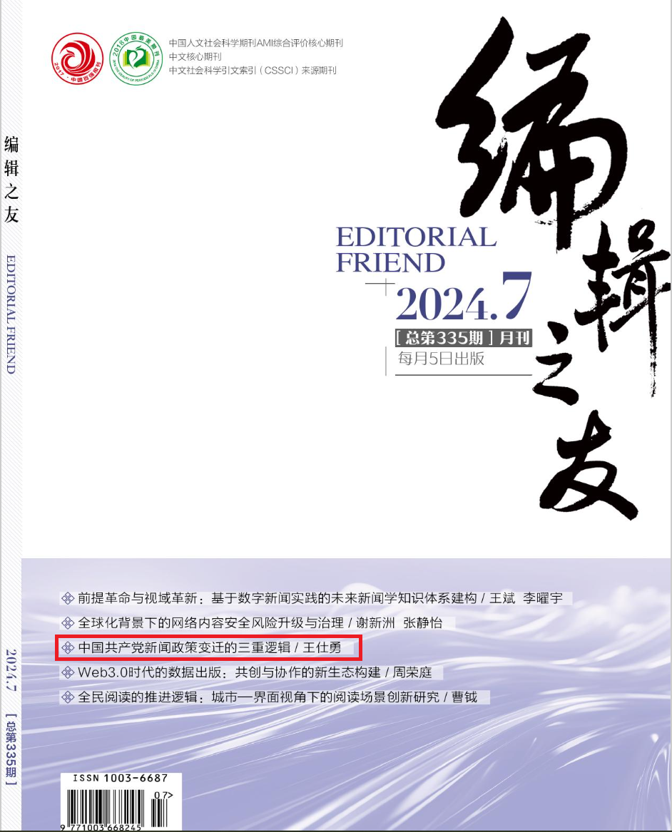 在2024年第7期《编辑之友》(CSSCI来源期刊)发表的《中国共产党新闻政策变迁的三重逻辑》一文中,王仕勇教授综合梳理中国共产党百余年新闻政策演变历程,将其视为一个连续性与阶段性统一的过程,也是根据外环境和内环境变化不断优化新闻政策结构,不断完善新闻政策功能,使党的新闻事业不断发展壮大的过程。借助多源流理论,分析认为党的新闻政策变迁依循三大逻辑:坚持“党管媒体”这一根本原则并因时因势不断创新的政治逻辑,重视、发展、规制和引导媒介技术的技术逻辑,符合新闻政策变迁自身规律的专业逻辑。