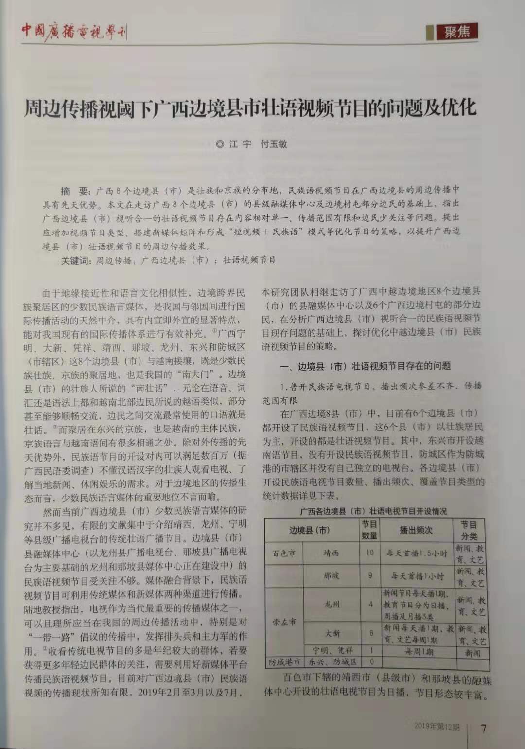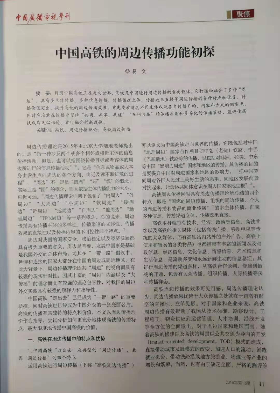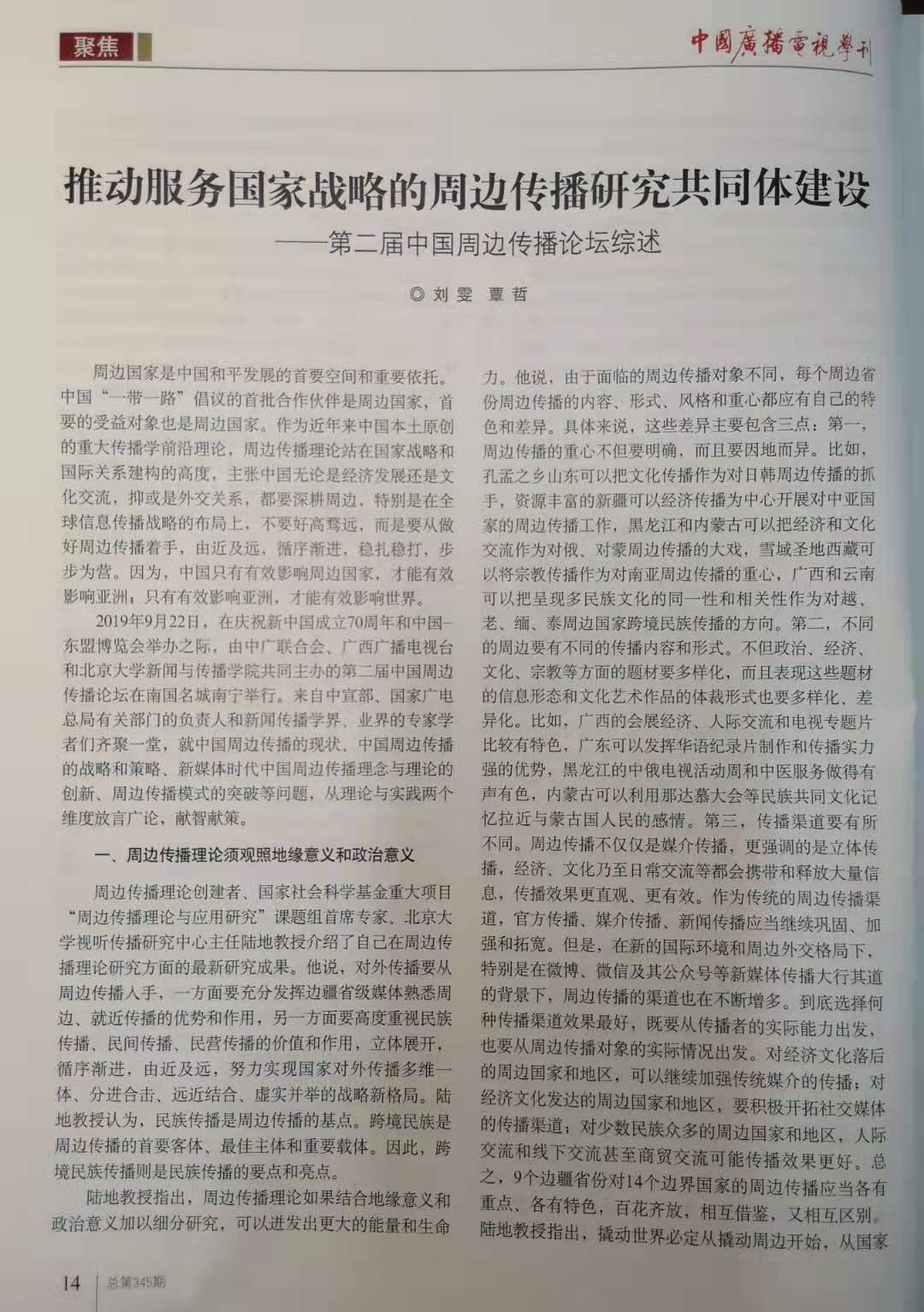 2019年12期,《中国广播电视学刊》发表了我院易文教授、江宇副教授以及覃哲博士等分别撰写的学术论文、论坛综述。这也是北京大学新闻与传播学院陆地教授主持的国家社科基金重大项目《周边传播理论与应用研究》阶段性成果。