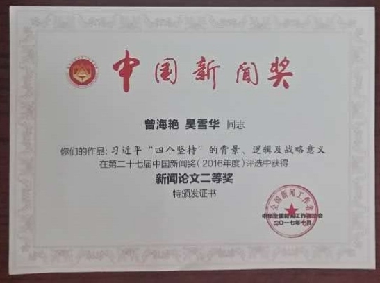 我院曾海艳、吴雪华两位老师的【习近平“四个坚持”的背景、逻辑及战略意义】获得中国新闻奖二等奖