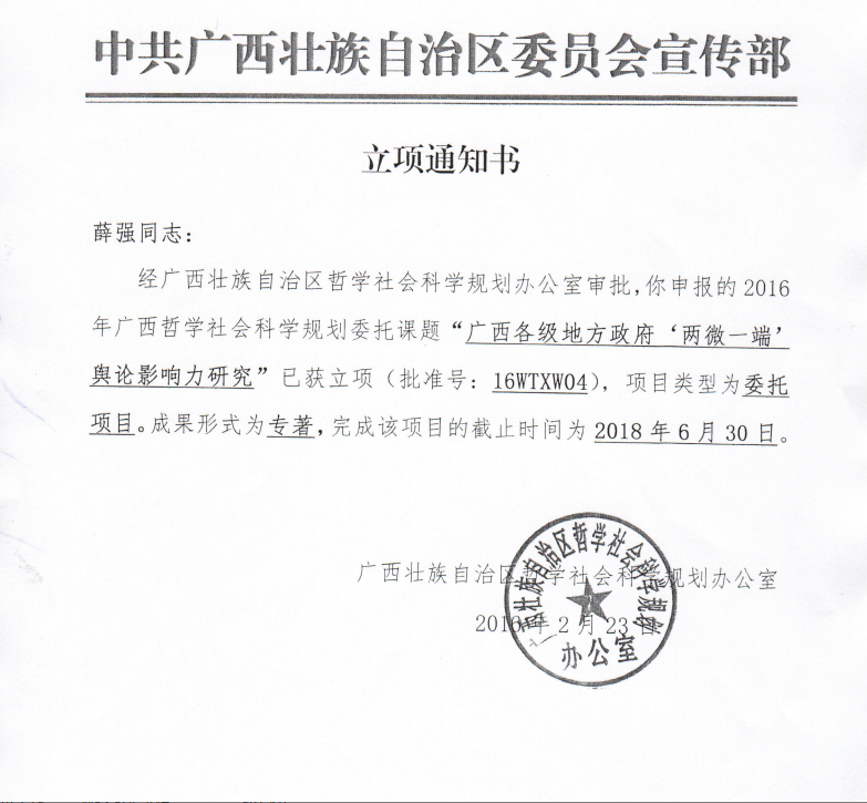 我院薛强副教授2016年申报广西哲社项目获立项