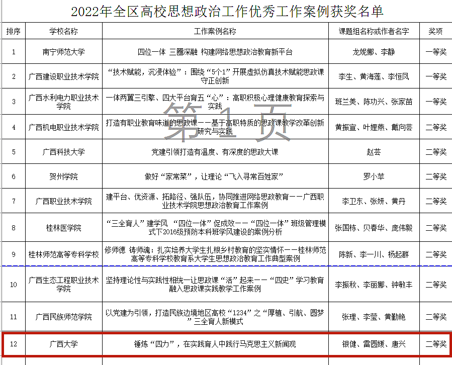 在2022年全区高校思想政治工作优秀调研报告和优秀工作案例征集中,我院银健、雷圆媛、唐兴老师申报的“锤炼‘四力’,在实践育人中践行马克思主义新闻观”获得优秀工作案例二等奖。