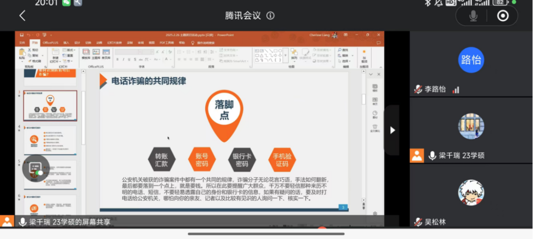 新闻传播学 2023 级学硕班团支部在活动中引入 “演员王星事件”“刷单返利” 等典型案例,深入剖析了电话诈骗的三大共性特征:伪造权威身份、虚构紧急场景、诱导向陌生账户转账或索要验证码。团支书还组织大家下载 “国家反诈中心 APP”,并详细演示来电预警、风险查询等功能,确保每位同学都能熟练掌握基础防护工具的使用方法。活动以 “知识讲解 + 工具赋能” 为特色,有效提升了同学们对电信诈骗的警惕性和应对能力。