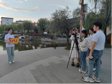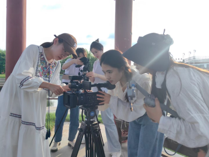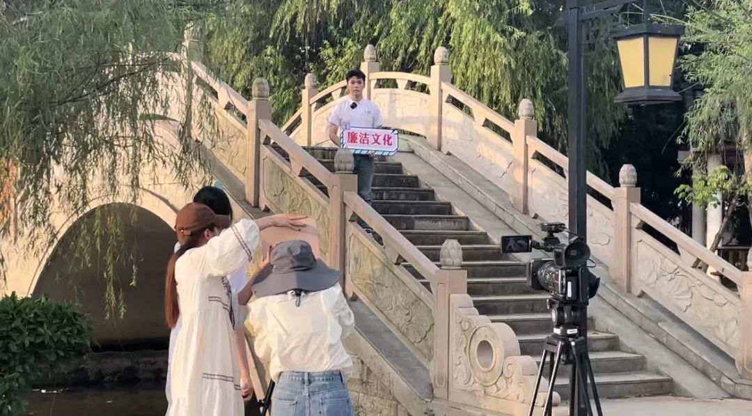 抵达“荷美覃塘”后,团队分别于“醉莲阁”、“陆绩码头”、“莲心广场”“万亩荷田”进行堪景、拍摄。炎炎夏日,炽热的阳光烘烤着大地,但同学们热情不减,坚持投入拍摄工作。俯身躬行,脚踏实地,团队成员们真正践行脚力、眼力、脑力、笔力,以期达到最佳拍摄效果,在润物无声中弘扬清正廉洁的传统美德,助力青年学子涵养克己奉公、清廉自守的精神品质。