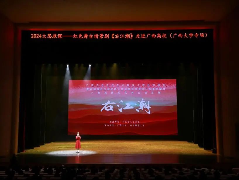 11月24日晚,为纪念革命先烈、传承红色精神,beats365亚洲版汇学堂上演了一场深刻的红色文化盛宴——红色舞台情景剧《右江潮》。此次展演不仅是一次艺术享受,更是一次心灵的洗礼,旨在深入开展思政教育,强化青年团员的历史使命感与责任感,是一堂生动的行走的思政课,我院组织30余名学生干部观看了这部意义深远的红色舞台情景剧。