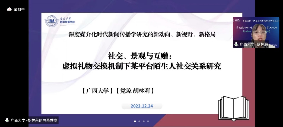 2021级学硕班的胡林莉和导师党琼助理教授合作的论文《社交、景观与互赠:虚拟礼物交换机制下某平台陌生人社交关系研究》荣获安徽大学新闻与传播学院举办的第二届数字传播与社会治理创新暨第十四届安徽省新闻传播学科研究生论坛优秀论文一等奖。