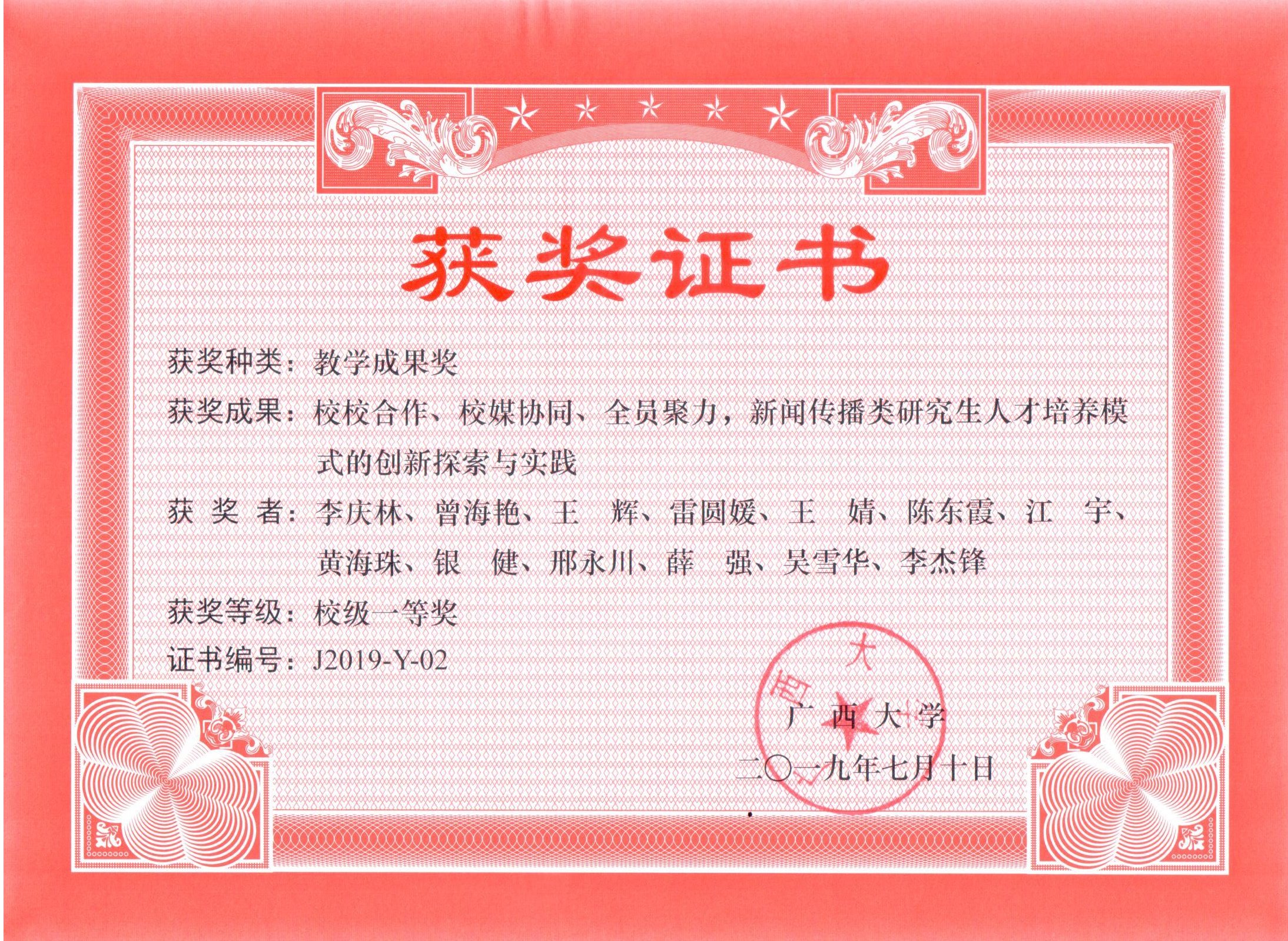 该教学成果是指2015年以来,我院努力构建的研究生培养模式,即校际协同、校媒协同、校内协同。这包括:与华南理工大学新闻与传播学院跨校联合、与人民网校媒协同,以“两广论坛”“广西新媒体实验室”以及自治区级研究生示范建设项目新媒体创新创业教育暨联合培养基地为抓手,构建资源共享、学用结合的新闻传播类研究生一流培养平台。同时,我院也在不断加强与对口支援高校的密切联系,贯通学界与业界,协同导师和学工队伍,旨在培养广西创新型新闻高端人才。该人才培养模式就是我院主动适应当下教育格局和全媒体时代新闻传媒业的重要探索与实践,并在这四年里开创了新闻传播研究生教育的新局面。