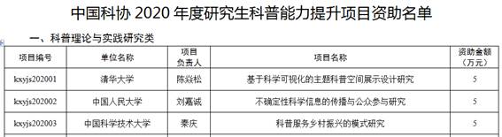 据悉,《中国科协科普部关于申报中国科协2020年度研究生科普能力提升项目的通知》发布后,共收到114所高校和科研院所推荐申报项目491个,经专家严格评审,确定对其中50个项目予以资助,陈岚、文艺晨一起申报的项目作为“科普理论与实践研究”类项目之一获得立项。该类其它项目立项单位大多数为世界一流大学建设高校。