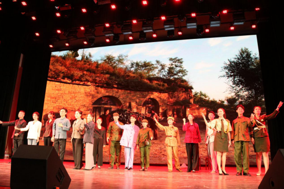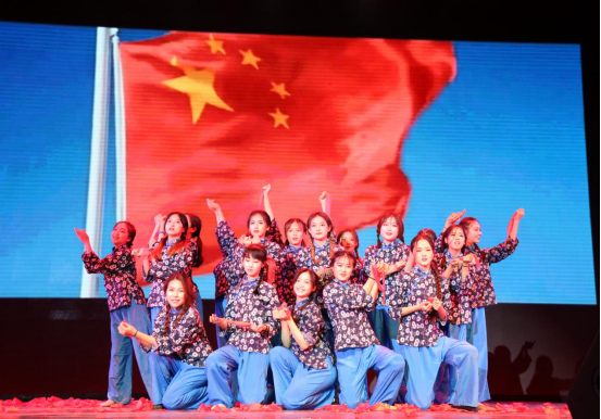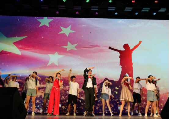 在晚会的最后,是新闻182班的合唱《我和我的祖国》,在主持人的邀请下,全体师生也跟着唱了起来,大礼堂的气氛一下子被调动了起来。随后,学院领导和老师也被邀请上台,和全体观众一同合唱,晚会的气氛也因此被推到了最高潮。在熟悉的旋律和嘹亮的歌声中,晚会圆满结束了。