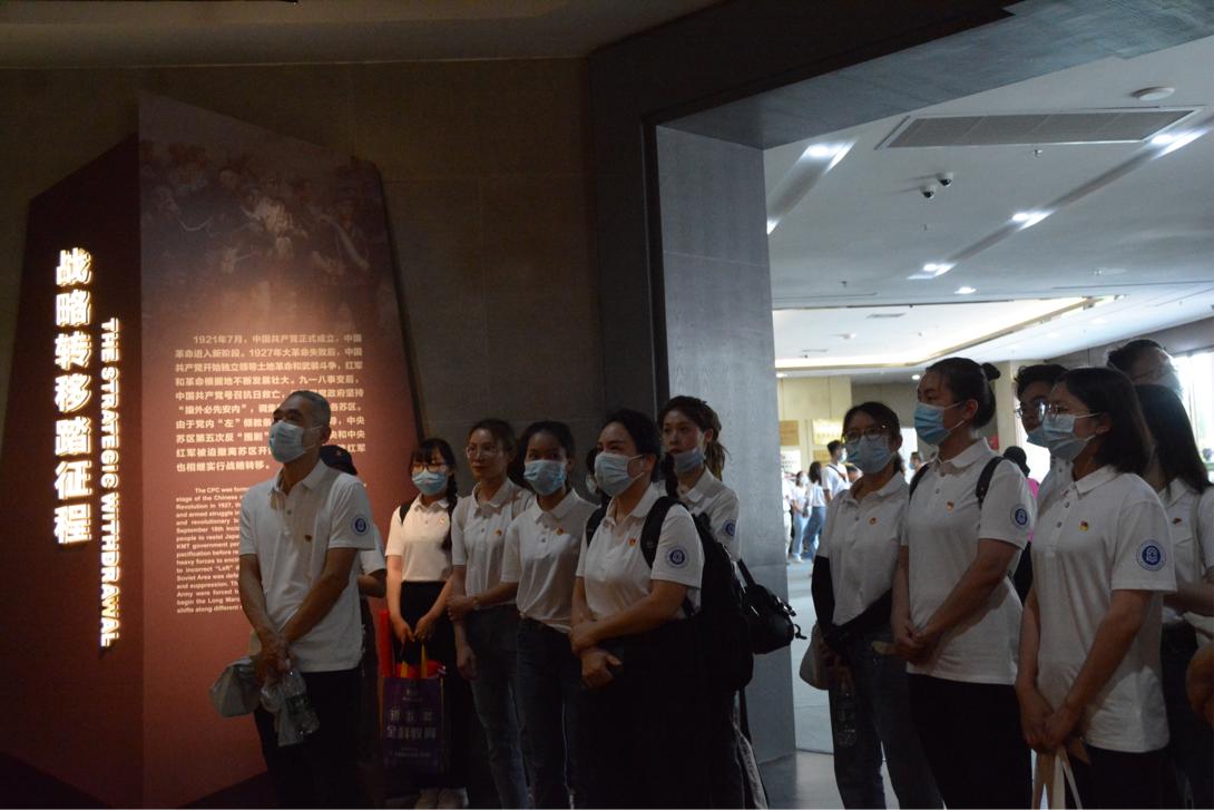 烈日炎炎,却阻挡不住师生们的热情。师生们走进红军长征湘江战役纪念馆,听取红军长征的伟大事迹,感受长征精神的伟大力量。在油画《陈树湘》前,大家停下脚步,久久凝视。此油画中,陈树湘躺在担架上,腹部鲜血直流。时任红三十四师师长的陈树湘奉命率部担负全军后卫,为掩护红军主力渡江,他身负重伤、不幸被俘,苏醒后用手从腹部伤口处绞断肠子,壮烈牺牲,年仅29岁,实现了自己“为苏维埃新中国流尽最后一滴血”的誓言,成为革命道路上不朽的“人民英雄”。陈树湘等革命烈士的事迹触动着现场每一位师生的心。
