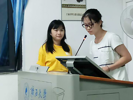 邓美姗同学(左)和邓柳丽(右)在作主题讲解