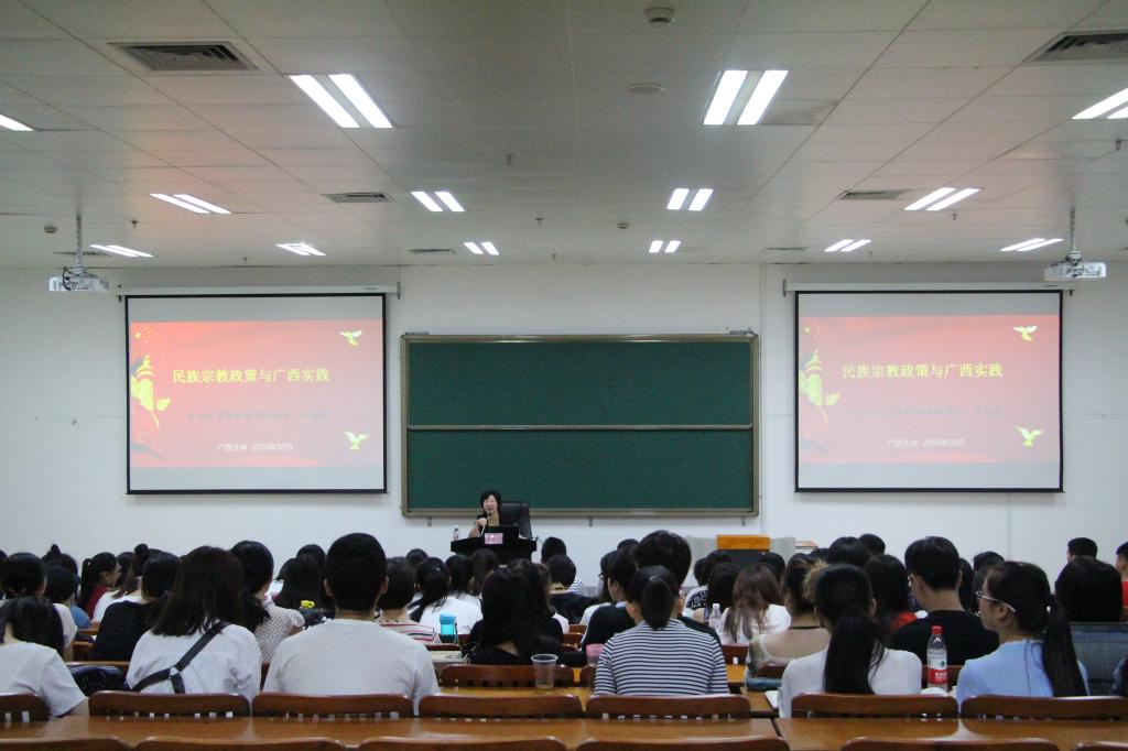 10月28日下午,自治区党委统战部副部长李银霞到beats365亚洲版新闻传播学院,以“民族宗教政策与广西实践”为主题,为我院学生讲授了一堂深刻的国情教育课,带领同学们学习民族宗教政策,鼓励大家成为一名合格的新闻工作者。
